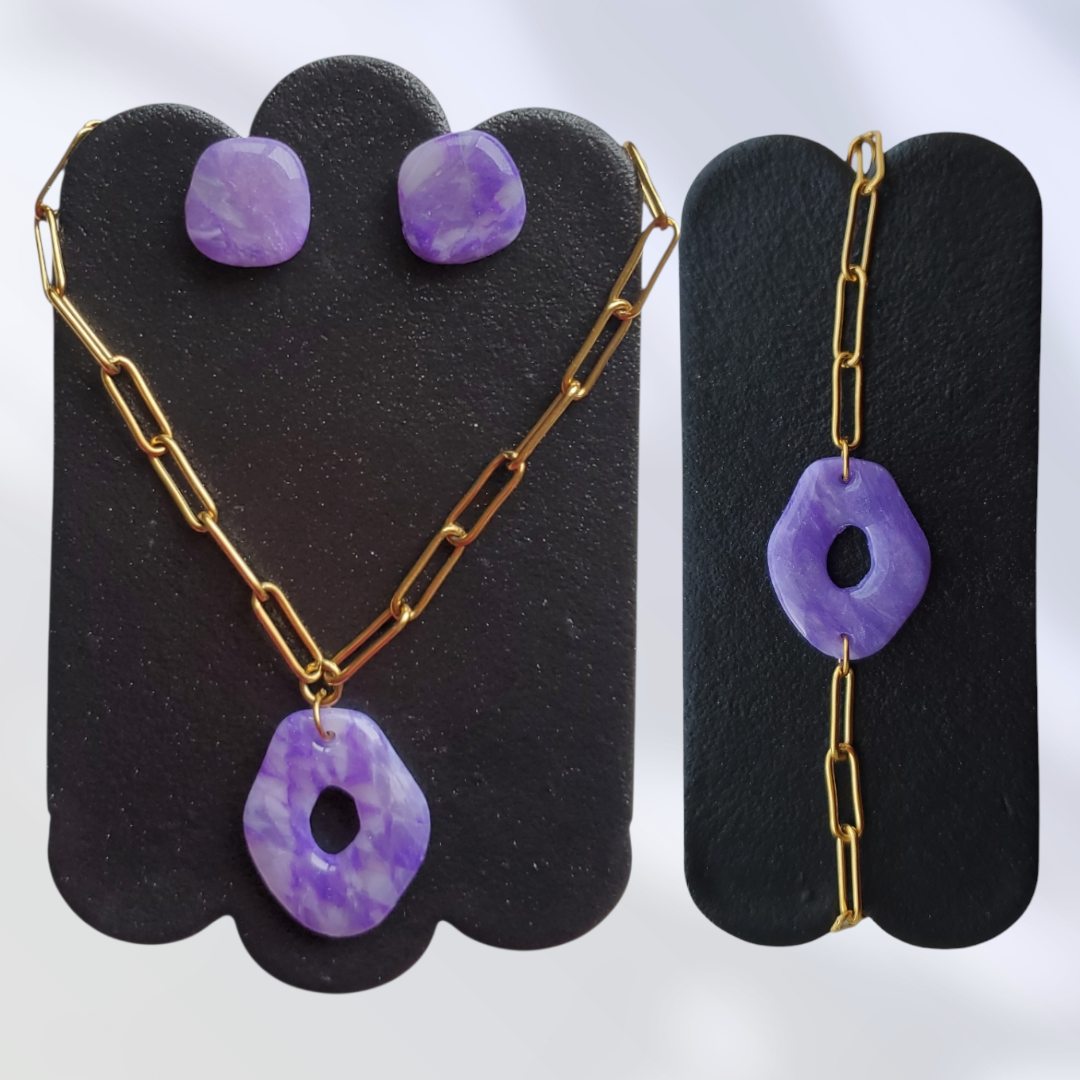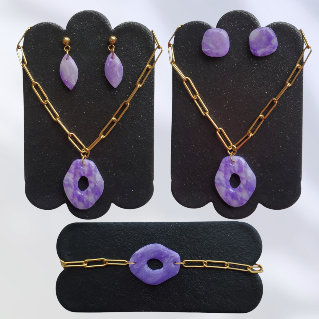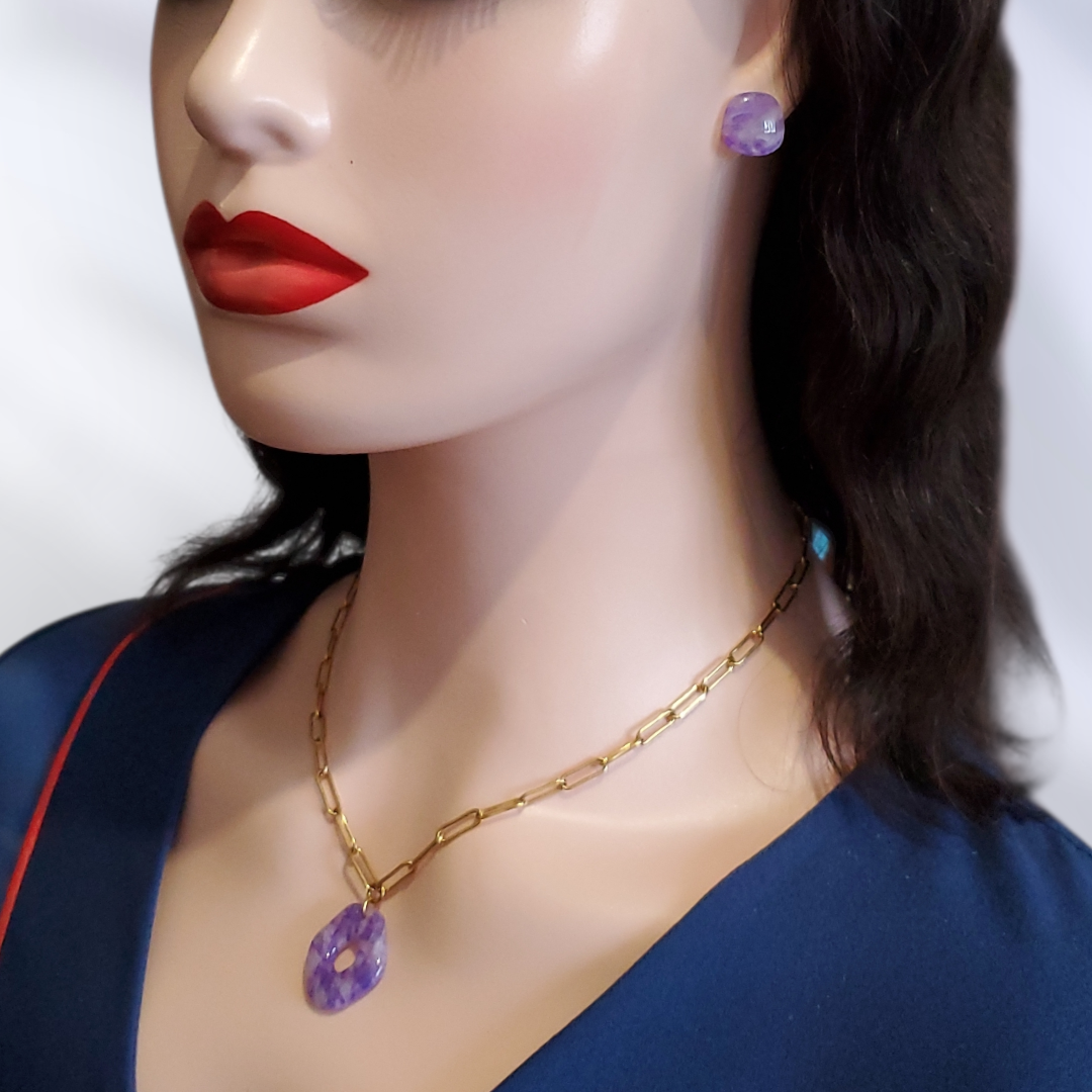 La pierre fine Améthyste est connue pour apporter calme et sérénité. Ces créations, inspirées de cette pierre, sont faites en argile polymère et vernies à la résine, avec une chaine réglable en acier inoxydable :