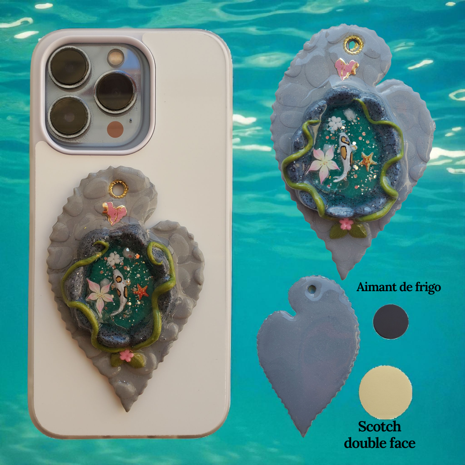 Bijou en argile polymère, peint à la main et vernis à la résine. Chaque bijou est livré avec un scotch double face et un aimant adhésif (à fixer vous-même) et peut servir de :