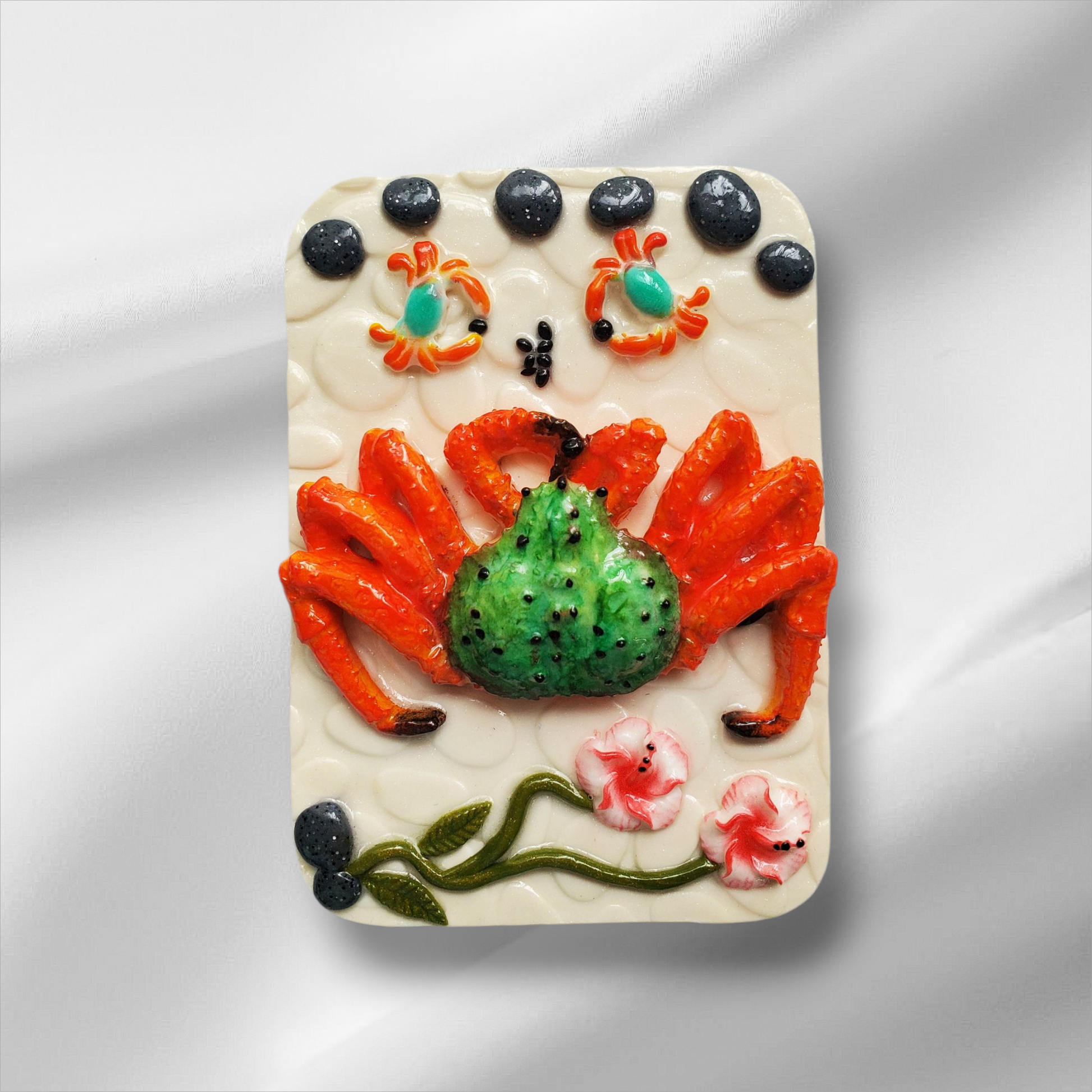 Une adorable petite famille d’araignées de mer : papa au ventre vert bien dodu, entouré de ses petits malicieux et de fleurs délicates.