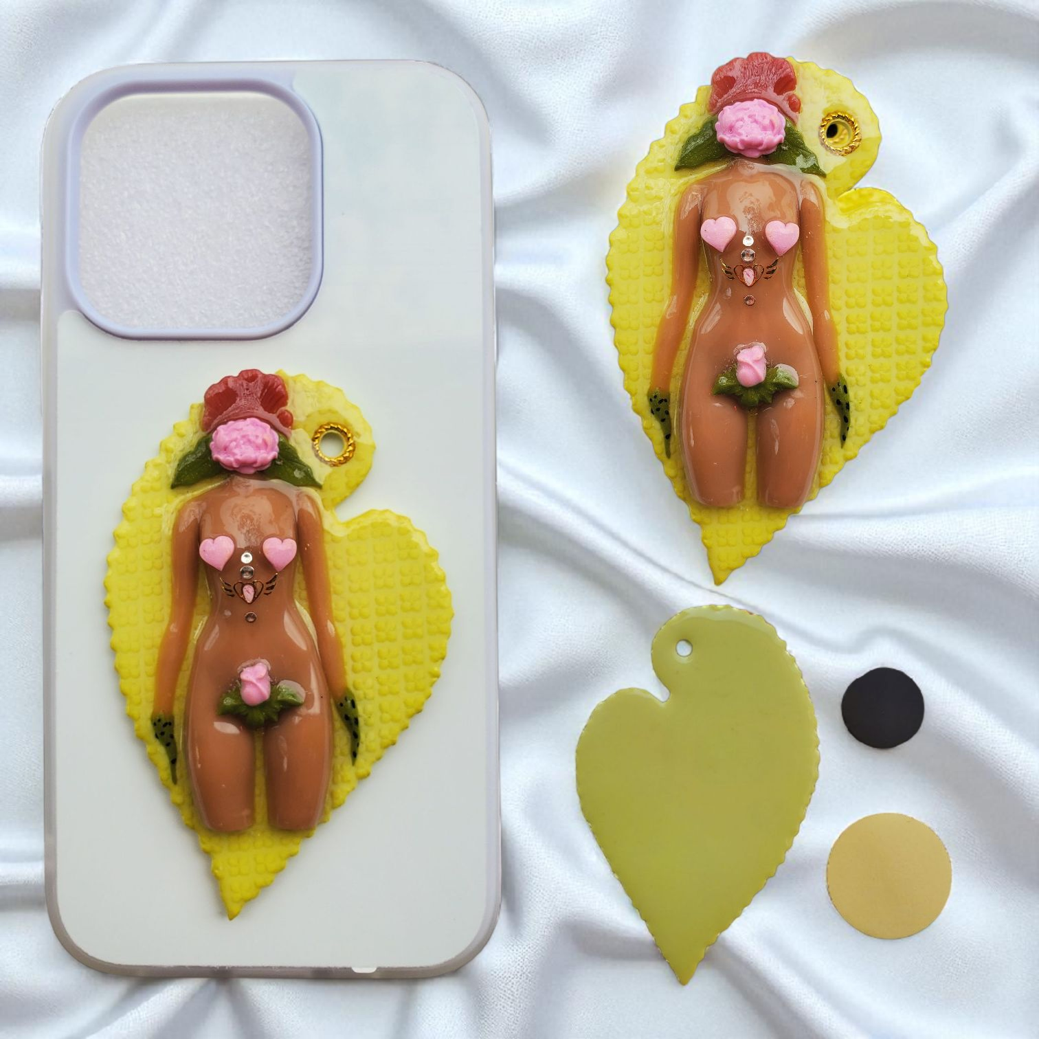 Bijou en argile polymère, peint à la main et vernis à la résine. Chaque bijou est livré avec un scotch double face et un aimant adhésif (à fixer vous-même) et peut servir de :