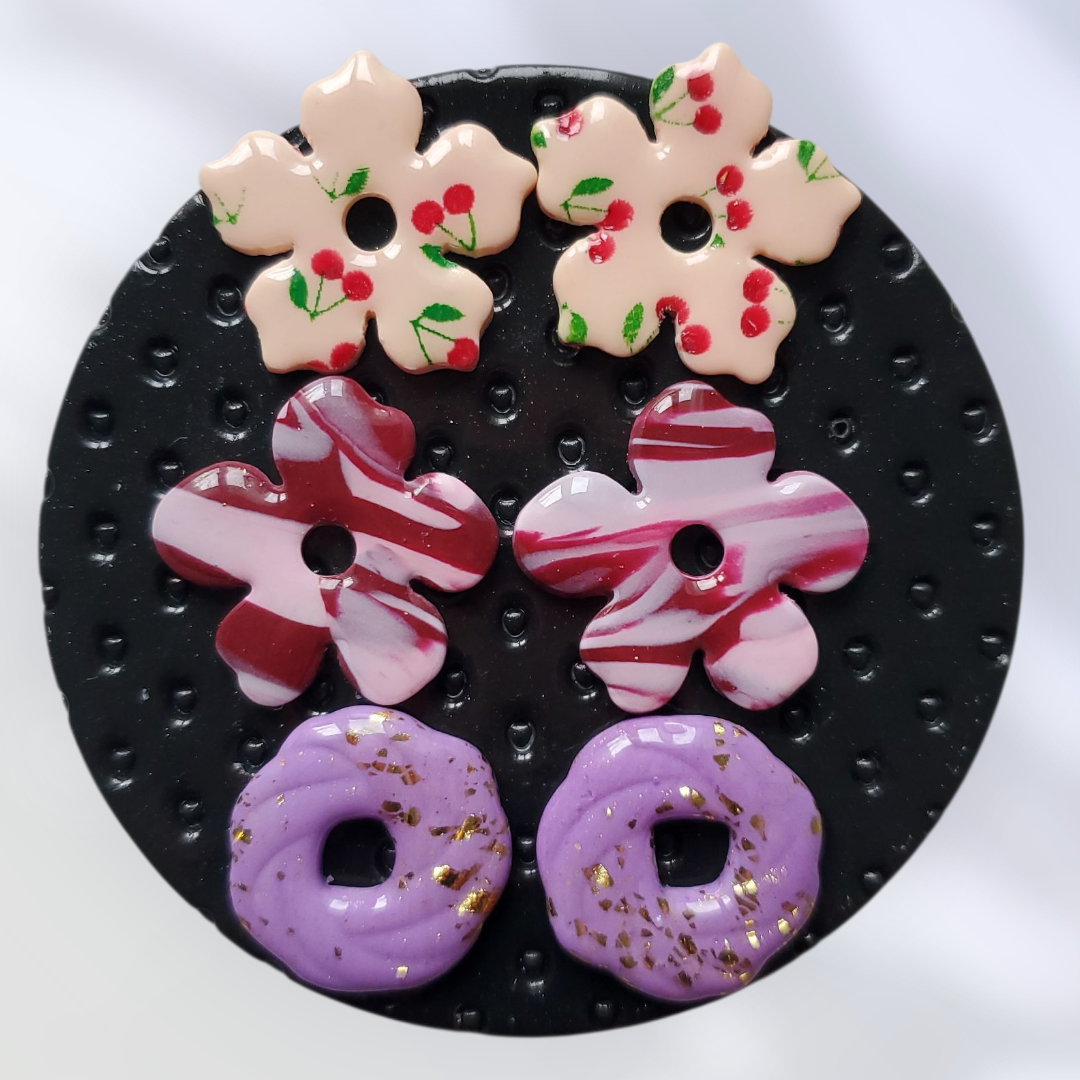 3 paires de pampilles de 25 mm vendues sans créoles, fabriquées à la main en argile polymère vernies à la résine.