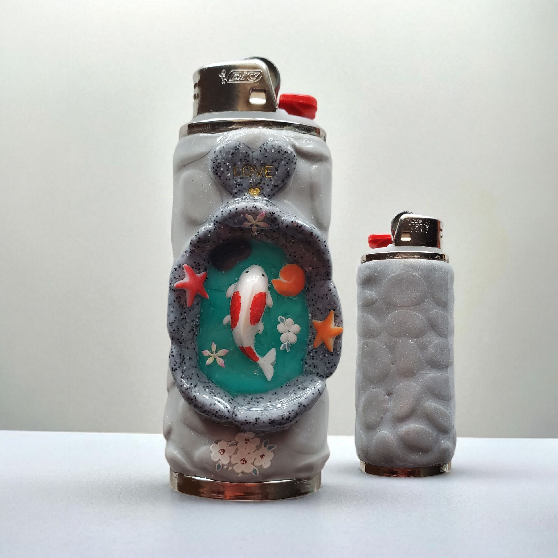 Étui à briquet avec une base en métal argenté, décoré en argile polymère peint à la main et vernis à la résine. Compatible avec les briquets BIC taille standard J6.