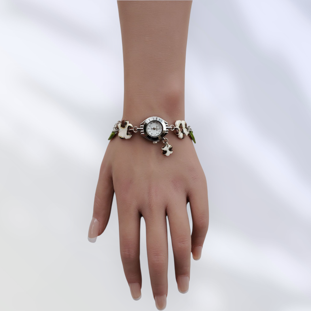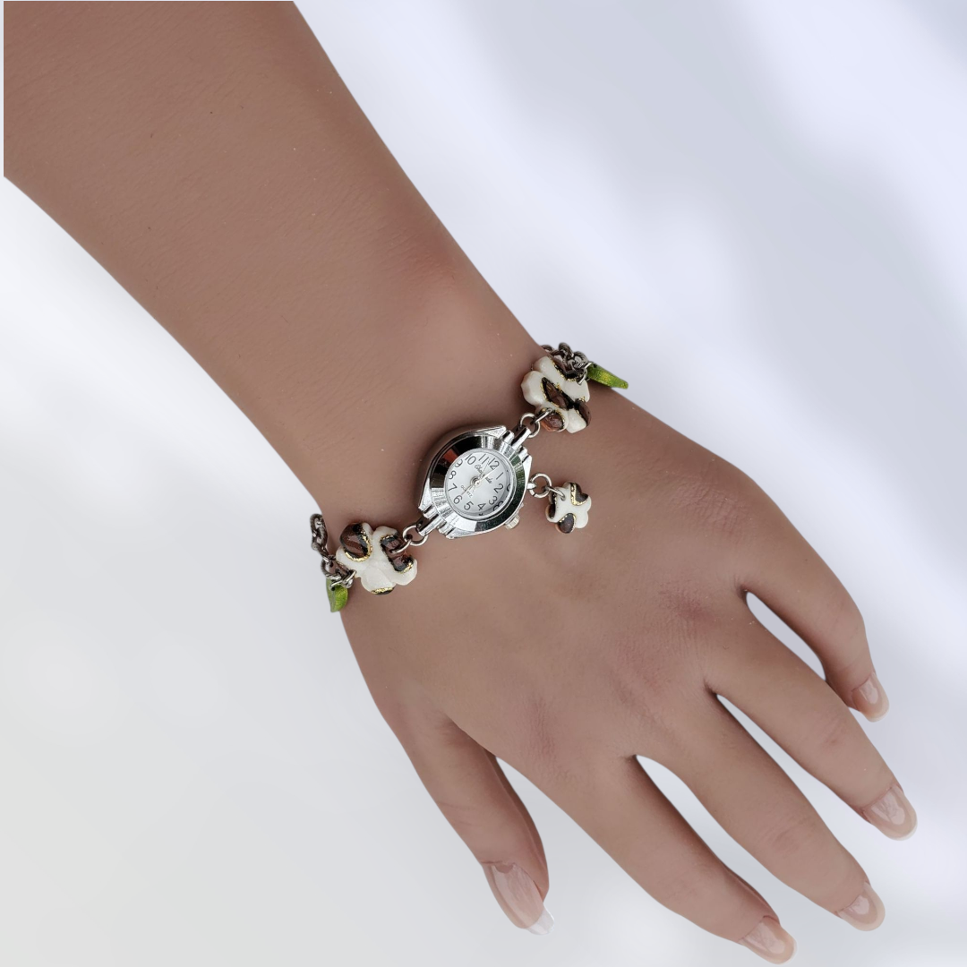 Cette élégante montre unique (1 seul exemplaire) avec un cadran sur fond blanc est décorée de trois fleurs au motif léopard et de deux petites feuilles. Elle a été faite à la main en argile polymère.