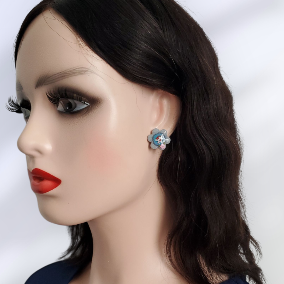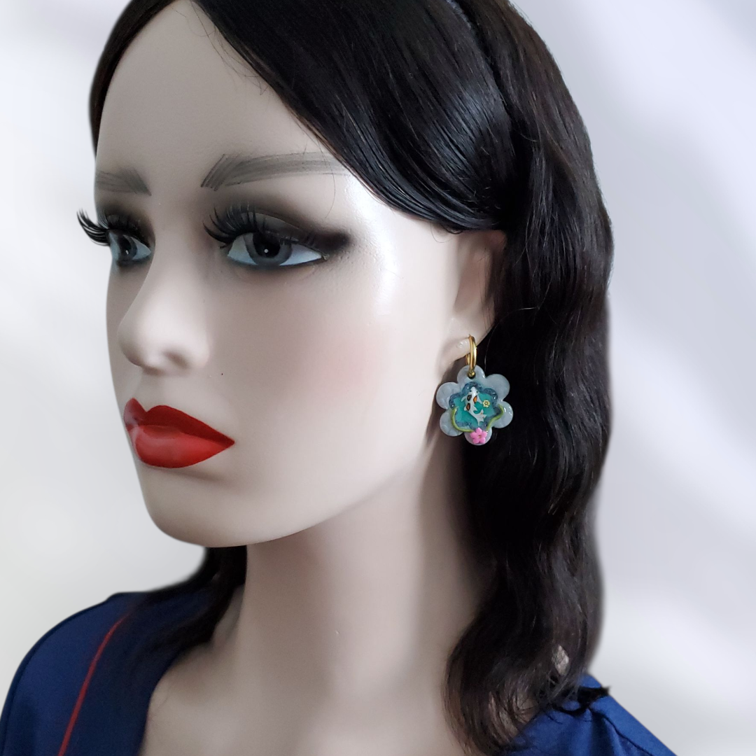 Une paire de pampilles de 30 mm vendues avec créoles lisses dorées de diamètre 14 mm ou de puces, fabriquées à la main en argile polymère et vernies à la résine.