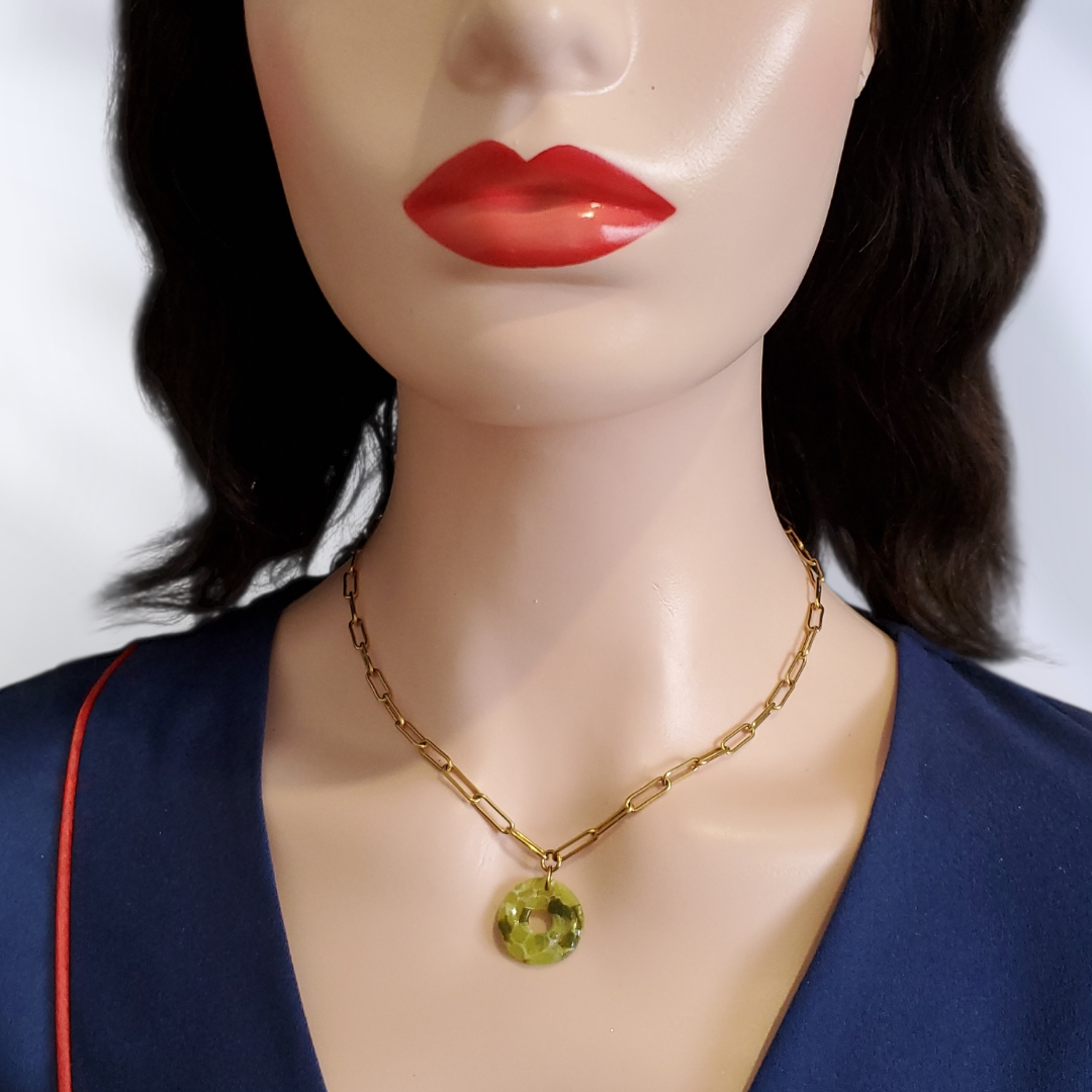 La pierre gemme Peridot est connue comme une pierre de protection puissante. Ces créations, inspirées de cette pierre, sont faites en argile polymère et vernies à la résine, avec une chaine réglable en acier inoxydable :